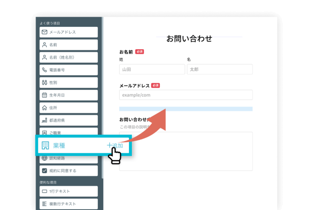 フォーム作成が簡単なのはもちろん、お客様の入力ミスを防げる機能を搭載。フォーム離脱を防ぎ、データの管理・運用も効率化します。さらに、ビジネスの成果アップにつながりやすい便利な機能を多数搭載しています。