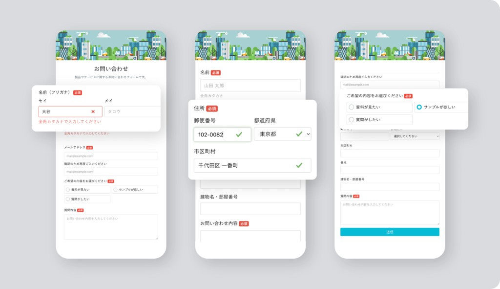 住所自動入力や、即時エラー表示(バリデーション機能)、項目の出し分け(条件分岐)など、ユーザーの入力ストレスを軽減し、フォーム離脱を防ぐ仕組みを搭載しています。