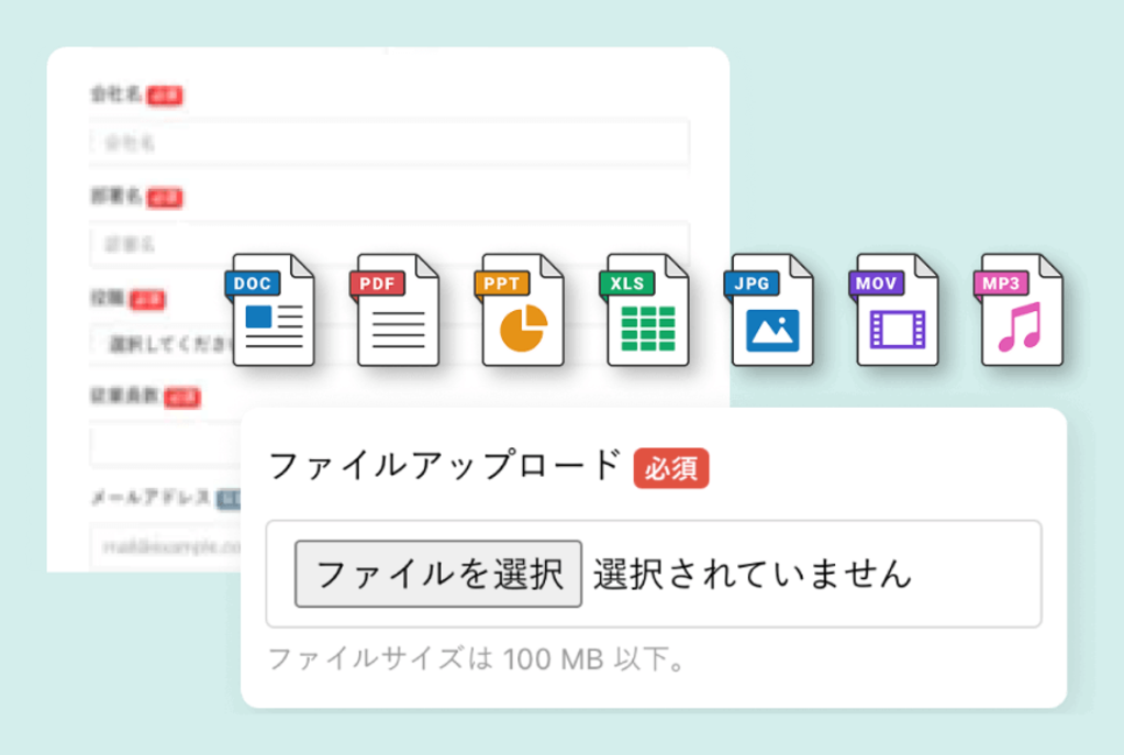 画像や資料など、ほぼ全ての形式のファイル添付が可能。書類提出が必要なフォームに便利です。